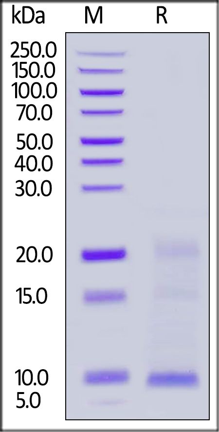 This protein carries a polyhistidine tag at the C-terminus. The protein has a calculated MW of 17.1 kDa. The protein migrates as 8-10 kDa, 15-20 kDa when calibrated against Star Ribbon Pre-stained Protein Marker under reducing (R) condition (SDS-PAGE).