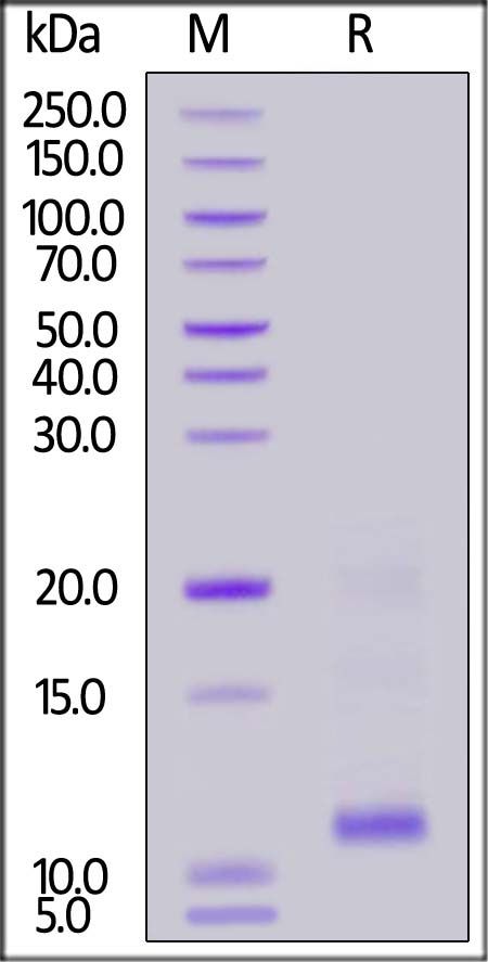 This protein carries a polyhistidine tag at the C-terminus, followed by an Avi tag (Avitag™). The protein has a calculated MW of 18.8 kDa. The protein migrates as 12 kDa under reducing (R) condition (SDS-PAGE).