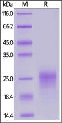 This protein carries a polyhistidine tag at the C-terminus. The protein has a calculated MW of 16.7 kDa. The protein migrates as 25-29 kDa when calibrated against Star Ribbon Pre-stained Protein Marker under reducing (R) condition (SDS-PAGE) due to glycosylation.