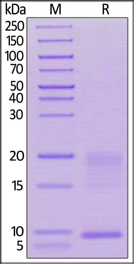 This protein carries a polyhistidine tag at the C-terminus. The protein has a calculated MW of 16.8 kDa. The protein migrates as 20-27 kDa when calibrated against Star Ribbon Pre-stained Protein Marker under non-reducing (NR) condition (SDS-PAGE) due to glycosylation.