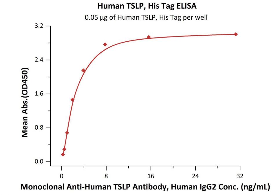 Thymic stromal lymphopoietin (TSLP) is an epithelial cell-derived cytokine involved in the pathology of inflammatory skin diseases, and is widely expressed by epithelial cells. Human TSLP cDNA encodes a 159 amino acid (aa) residue precursor protein with a 28 aa signal sequence (4, 5). Human TSLP has been shown to developing nondeletional central tolerance, amplifying epithelium-induced class switching, inducing atopic diseases and maintaining intestinal noninflammatory environment. Among diverse cells responding to Human TSLP, CD11c+ dendritic cells are the most obviously characterized target cells.