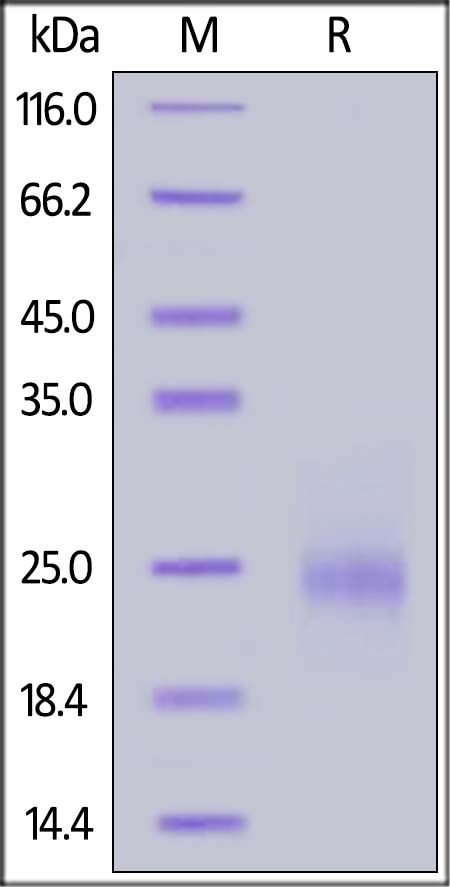 This protein carries a polyhistidine tag at the C-terminus. The protein has a calculated MW of 15.9 kDa. The protein migrates as 23-27 kDa when calibrated against Star Ribbon Pre-stained Protein Marker under reducing (R) condition (SDS-PAGE) due to glycosylation.