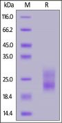 This protein carries a polyhistidine tag at the C-terminus. The protein has a calculated MW of 15.5 kDa. The protein migrates as 20-30 kDa when calibrated against Star Ribbon Pre-stained Protein Marker under reducing (R) condition (SDS-PAGE) due to glycosylation.