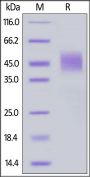 This protein carries a polyhistidine tag at the C-terminus. The protein has a calculated MW of 32.3 kDa. The protein migrates as 40-55 kDa when calibrated against Star Ribbon Pre-stained Protein Marker under reducing (R) condition (SDS-PAGE) due to glycosylation.
