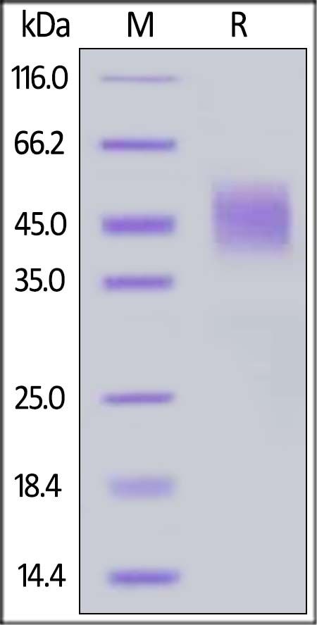 This protein carries a polyhistidine tag at the C-terminus. The protein has a calculated MW of 32.3 kDa. The protein migrates as 40-55 kDa when calibrated against Star Ribbon Pre-stained Protein Marker under reducing (R) condition (SDS-PAGE) due to glycosylation.