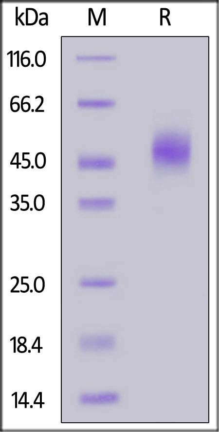 This protein carries a polyhistidine tag at the C-terminus. The protein has a calculated MW of 32.3 kDa. The protein migrates as 45-60 kDa under reducing (R) condition (SDS-PAGE) due to glycosylation.
