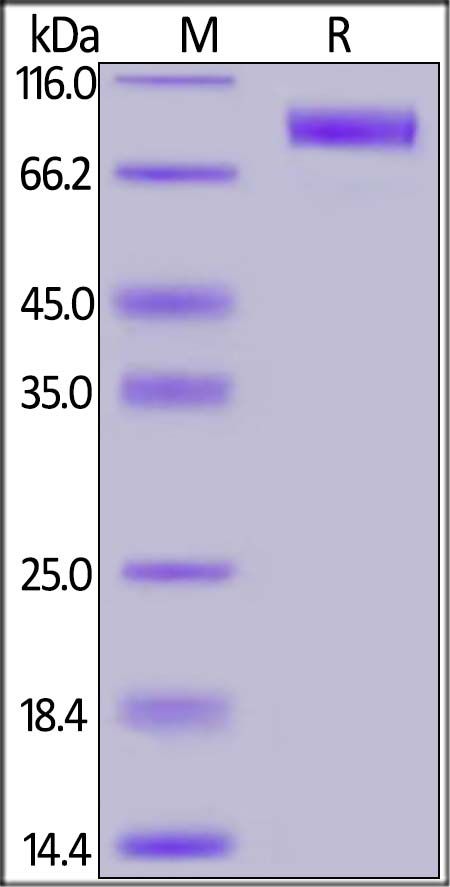This protein carries a polyhistidine tag at the C-terminus. The protein has a calculated MW of 61.6 kDa. The protein migrates as 80-100 kDa when calibrated against Star Ribbon Pre-stained Protein Marker under reducing (R) condition (SDS-PAGE) due to glycosylation.