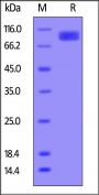 This protein carries a polyhistidine tag at the C-terminus. The protein has a calculated MW of 74.9 kDa. The protein migrates as 85-100 kDa under reducing (R) condition (SDS-PAGE) due to glycosylation.