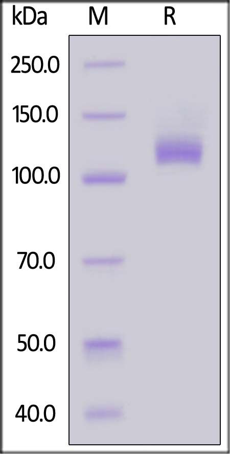This protein carries a human IgG1 Fc tag at the C-terminus. The protein has a calculated MW of 100.7 kDa. The protein migrates as 126 kDa±5 kDa when calibrated against Star Ribbon Pre-stained Protein Marker under reducing (R) condition (SDS-PAGE) due to glycosylation.