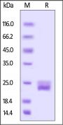 This protein carries a polyhistidine tag at the N-terminus, followed by an Avi tag (Avitag™). The protein has a calculated MW of 17.3 kDa. The protein migrates as 22-24 kDa and 24-26 kDa under reducing (R) condition (SDS-PAGE) due to glycosylation.