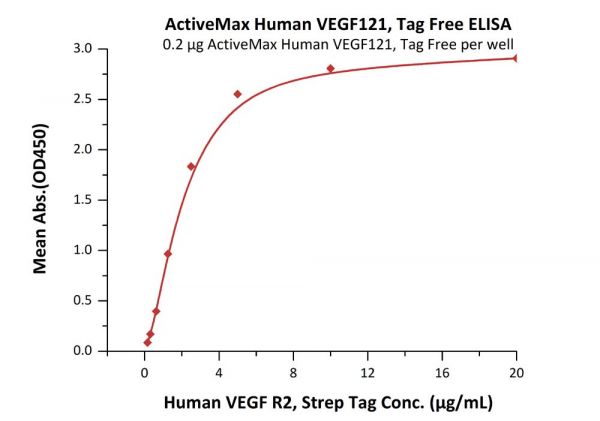 Vascular endothelial growth factor (VEGF) is also known as vascular permeability factor (VPF) and VEGF-A, and is a member of the platelet-derived growth factor (PDGF)/vascular endothelial growth factor (VEGF) family and encodes a protein that is often found as a disulfide linked homodimer. This protein is a glycosylated mitogen that specifically acts on endothelial cells and has various effects, including mediating increased vascular permeability, inducing angiogenesis, vasculogenesis and endothelial cell growth, promoting cell migration, and inhibiting apoptosis. Alternatively spliced transcript variants, encoding either freely secreted or cell-associated isoforms, have been characterized. Alternatively spliced isoforms of 121, 145, 165, 183, 189 and 206 amino acids in length are expressed in humans. VEGF165 appears to be the most abundant and potent isoform, followed by VEGF121 and VEGF189. VEGF121 is the only form that lacks a basic heparinbinding region and is freely diffusible. Mouse embryos expressing only the corresponding isoform (VEGF120) do not survive to term, and show defects in skeletogenesis. Human VEGF121 shares 87% aa sequence identity with corresponding regions of mouse and rat, 93% with feline, equine and bovine, and 91%, 95% and 96% with ovine, canine and porcine VEGF, respectively. VEGF121 induces the proliferation of lymphatic endothelial cells. The lymphangiogenesis may be promoted by upregulation of VEGF121, which may in turn act in part via induction of VEGF-C.
