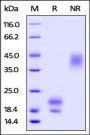 This protein carries no "tag". The protein has a calculated MW of 14.1 kDa. The protein migrates as 15-16 kDa and 17-20 kDa under reducing (R) condition, and 30-40 kDa under non-reducing (NR) condition (SDS-PAGE) due to glycosylation.