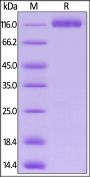 This protein carries a polyhistidine tag at the C-terminus, followed by an Avi tag (Avitag™). The protein has a calculated MW of 85.9 kDa. The protein migrates as 110-120 kDa when calibrated against Star Ribbon Pre-stained Protein Marker under reducing (R) condition (SDS-PAGE) due to glycosylation.
