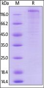 This protein carries a mouse IgG2a Fc tag at the C-terminus. The protein has a calculated MW of 109.8 kDa. The protein migrates as 140 kDa when calibrated against Star Ribbon Pre-stained Protein Marker under reducing (R) condition (SDS-PAGE) due to glycosylation.
