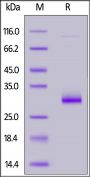 This protein carries a polyhistidine tag at the C-terminus. The protein has a calculated MW of 29.0 kDa. The protein migrates as 30 kDa under reducing (R) condition (SDS-PAGE) due to glycosylation.