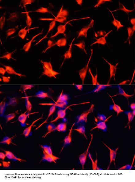 A synthetic peptide corresponding to a sequence within amino acids 300 to the C-terminus of human GFAP (NP_002046.1).