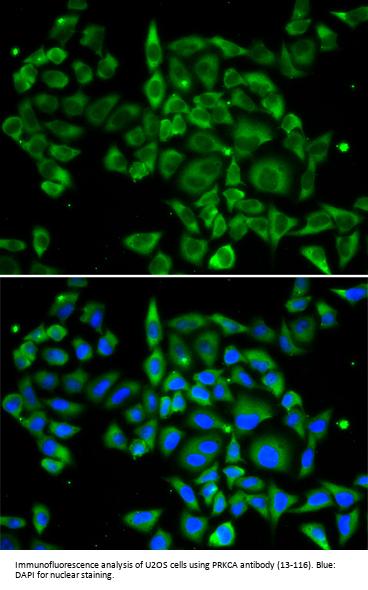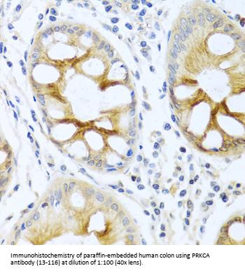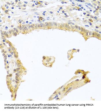 Protein kinase C (PKC) is a family of serine- and threonine-specific protein kinases that can be activated by calcium and the second messenger diacylglycerol. PKC family members phosphorylate a wide variety of protein targets and are known to be involved in diverse cellular signaling pathways. PKC family members also serve as major receptors for phorbol esters, a class of tumor promoters. Each member of the PKC family has a specific expression profile and is believed to play a distinct role in cells. The protein encoded by this gene is one of the PKC family members. This kinase has been reported to play roles in many different cellular processes, such as cell adhesion, cell transformation, cell cycle checkpoint, and cell volume control. Knockout studies in mice suggest that this kinase may be a fundamental regulator of cardiac contractility and Ca(2+) handling in myocytes.