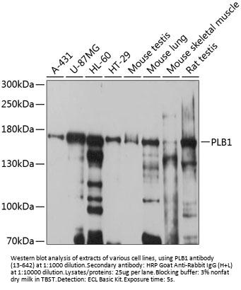 Recombinant fusion protein containing a sequence corresponding to amino acids 1110-1415 of human PLB1 (NP_694566.4).