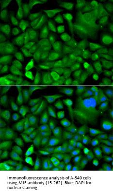 Recombinant fusion protein containing a sequence corresponding to amino acids 1-115 of human MIF (NP_002406.1).