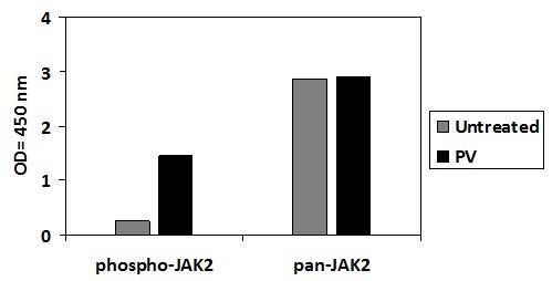 The antibody pair provided in this kit recognizes Human JAK2 phosphorylated at site Tyrosine-1007/1008 as well as total JAK2.