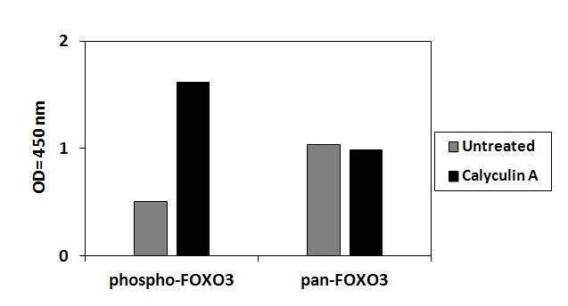 HeLa cells were treated or untreated with Calyculin A. Cell lysates were analyzed using this phosphoELISA and Western Blot.