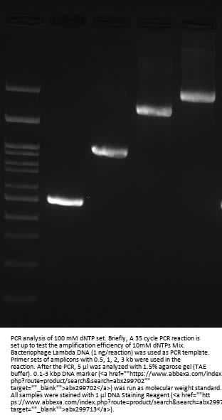 100 mM dNTP Set consists of all four deoxynucleotides (dATP, dCTP, dGTP, dTTP), two vials each at a concentration of 100 mM. Each vial is a ready-to-use solution and contains 250 µl of 25 µmol dNTP in purified water (pH 7.5). The deoxynucleotides are suitable for use in polymerase chain reaction (PCR), sequencing, fill-in, nick translation, cDNA synthesis, and TdT tailing reactions.