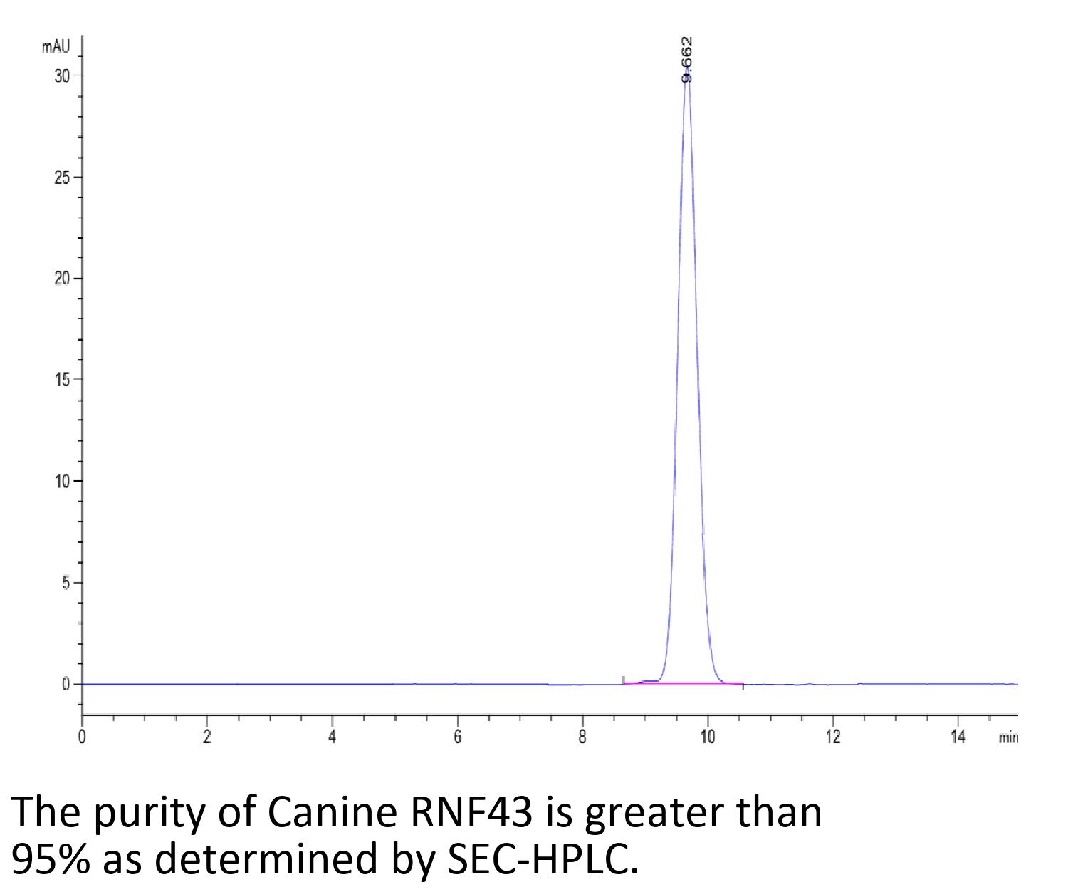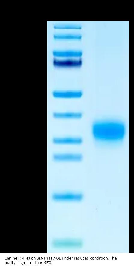 Recombinant Canine RNF43 Protein is expressed from HEK293 with His tag at the C-terminus.It contains Gly24-Tyr197.