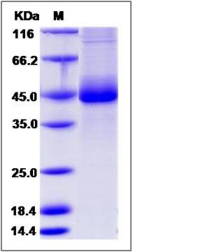 The recombinant canine IL3RA comprises 293 amino acids and has a predicted molecular mass of 34.2 kDa. The apparent molecular mass of the protein is approximately 44 kDa in SDS-PAGE under reducing conditions.