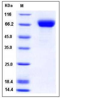 The secreted recombinant influenza A H5N1 HA (A/duck/Hunan/795/2002 (H5N1)) comprises 524 amino acids and has a predicted molecular mass of 60 kDa. As a result of glycosylation, it migrates as an approximately 65-75 kDa band in SDS-PAGE under reducing conditions.
