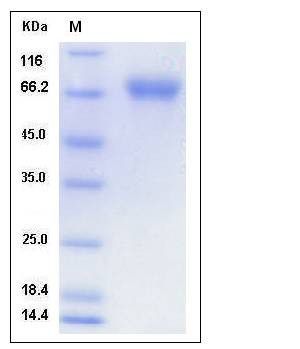 The secreted recombinant hemagglutinin of Influenza A virus H4N8 HA (A/chicken/Alabama/1/1975(H4N8)) comprises 523 amino acids and has a predicted molecular mass of 59 kDa. As a result of glycosylation, it migrates as an approximately 75 kDa band in SDS-PAGE under reducing conditions.