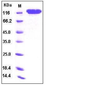 The recombinant CD146/Fc chimera comprises 774 amino acids and predicts a molecular mass of 86.4 kDa. As a result of glycosylation, the recombinant protein migrates as an approximately 120-130 kDa band in SDS-PAGE under reducing conditions.