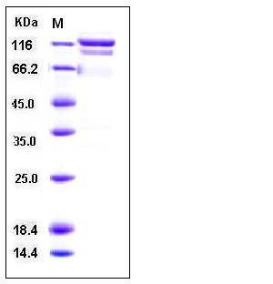 The recombinant human DC-SIGNR/Fc is a disulfide-linked homodimer after removal of the signal peptide. The reduced monomer consists of 580 amino acids and has a predicted molecular mass of 65 kDa. As a result of glycosylation, the apparent molecular mass of rhDC-SIGNR/Fc is approximately 110-140 kDa & 65-70 kDa corresponding to the homodimer and monomer respectively in SDS-PAGE under non-reduced conditions.