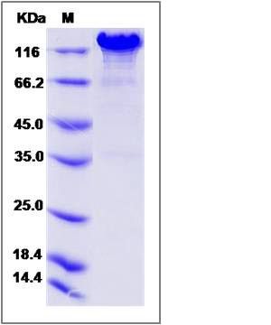 The recombinant human NRP2/Fc is a disulfide-linked homodimer. The reduced monomer comprises 1072 amino acids and has a predicted molecular mass of 120.7 kDa. The apparent molecular mass of the protein is approximately 119-129 kDa in SDS-PAGE under reducing conditions.
