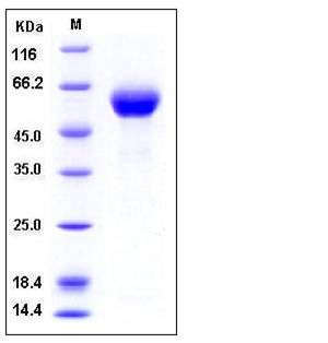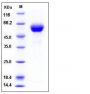 The recombinant human DDR1 consists of 409 amino acids and has a calculated molecular mass of 45.7 kDa. The apparent molecular mass of rh DDR1 is approximately 55-60 kDa in SDS-PAGE under reducing conditions due to glycosylation.