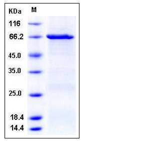 The recombinant human CSK/GST chimera consists of 674 amino acids and has a predicted molecular mass of 77 kDa. It migrates as an approximately 66 kDa band in SDS-PAGE under reducing conditions.