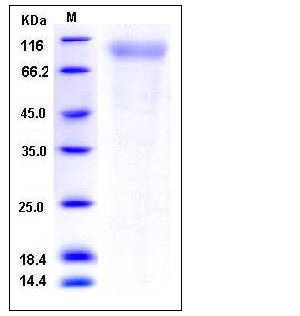 The recombinant human CD180 consists of 614 amino acids and predictes a molecular mass of 69 kDa. In SDS-PAGE under reducing conditions, the apparent molecular mass of rhCD180 is approximately 90-100 kDa due to glycosylation.