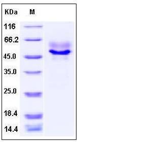 The recombinant human SDC1 consists of 245 amino acids and predictes a molecular mass of 25.6 kDa. In SDS-PAGE under reducing conditions, the apparent molecular mass of rh SDC1 is approximately 48-55 kDa due to glycosylation.