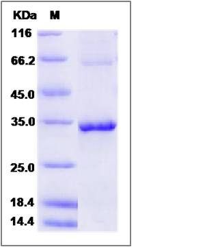 The secreted recombinant human NMNAT1 consists of 289 amino acids and predicts a molecular mass of 33.3 KDa. The apparent molecular mass of the protein is approximately 34 KDa in SDS-PAGE under reducing conditions due to glycosylation.