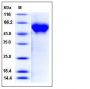 The recombinant human CD46 consists of 305 amino acids and has a predicted molecular mass of 34 kDa. As a result of glycosylation, the apparent molecular mass of rh CD46 is approximately 55-60 kDa in SDS-PAGE under reducing conditions.