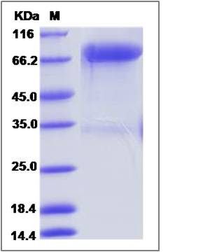The recombinant human ROR1/Fc comprises 615 amino acids and has a predicted molecular mass of 69 kDa. The apparent molecular mass of the protein is approximately 69 kDa in SDS-PAGE under reducing conditions.