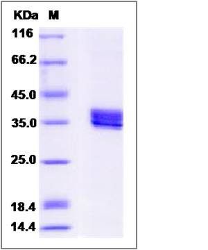 The recombinant human TPM4 comprises 267 amino acids and has a predicted molecular mass of 30.8 kDa. The apparent molecular mass of the protein is approximately 35-40 kDa in SDS-PAGE under reducing conditions due to glycosylation.