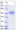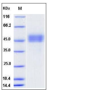 The recombinant heterodimer of human CD3D/CD3E comprises 670 (333+354) amino acids and has a calculated molecular mass of 77.5 (37.5+40? kDa. As a result of glycosylation, the apparent molecular mass of human CD3D/CD3E heterodimer is approximately 45-50 kDa in SDS-PAGE under reducing conditions.