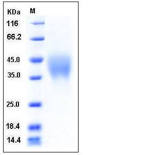 The recombinant mouse PILRA consists of 177 amino acids and has a predicted molecular mass of 20.2 kDa. As a result of glycosylation, the apparent molecular mass of rm PILRA is approximately 35-45 kDa in SDS-PAGE under reducing conditions.