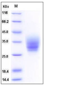 The secreted recombinant mouse BSG comprises 199 amino acids and has a predicted molecular mass of 30 kDa. As a result of glycosylation, the apparent molecular mass of rm BSG is approximately 30-35 kDa in SDS-PAGE under reducing conditions.