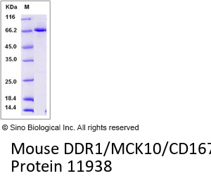 The recombinant mouse DDR1/GST chimera consists of 668 amino acids and has a calculated molecular mass of 75.8kDa. The recombinant protein migrates as an approximately 68 kDa band in SDS-PAGE under reducing conditions.