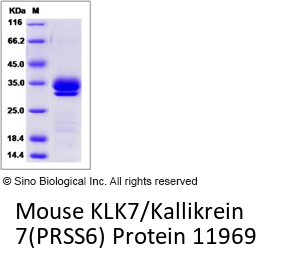 The recombinant mouse KLK7 comprises 239 amino acids and has a predicted molecular mass of 26.5 kDa. The apparent molecular mass of the protein is approximately 31 and 34 kDa in SDS-PAGE under reducing conditions due to glycosylation.