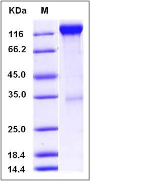 The recombinant mouse KDR /Fc comprises 984 amino acids and has a predicted molecular mass of 110 KDa. The apparent molecular mass of the protein is approximately 120 KDa in SDS-PAGE under reducing conditions due to glycosylation.