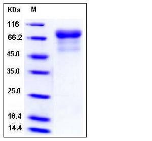 The secreted recombinant influenza A H5N1 HA (A/Hong kong/213/03 (H5N1)) comprises 524 amino acids and has a predicted molecular mass of 60 kDa. As a result of glycosylation, it migrates as an approximately 75 kDa band in SDS-PAGE under reducing conditions.