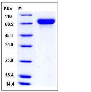 The secreted recombinant influenza A H1N1 hemagglutinin (A/Texas/05/2009 (H1N1)) comprises 523 amino acids and has a predicted molecular mass of 59 kDa. As a result of glycosylation, the apparent molecular mass of the protein is approximately 70-80 kDa in SDS-PAGE under reducing conditions.