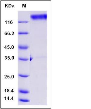 The recombinant Rat LAMP1/Fc is a disulfide-linked homodimer. The reduced monomer comprises 591 amino acids and has a predicted molecular mass of 65.1 kDa. The apparent molecular mass of the protein is approximately 123 kDa in SDS-PAGE under reducing conditions.
